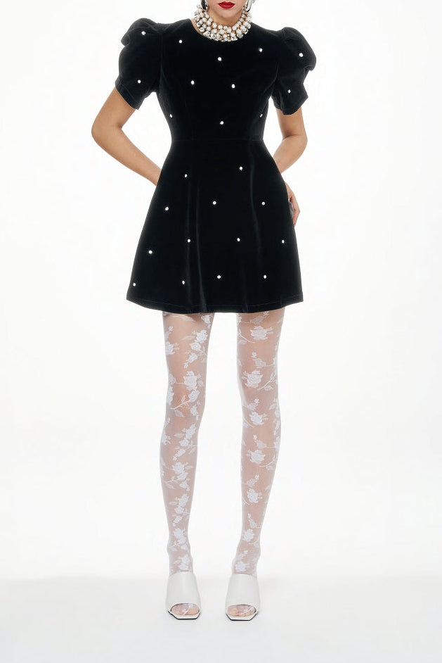 Abito corto in velluto con maniche corte a sbuffo e strass applicati che donano un tocco luminoso. Sono incluse le maniche lunghe, non presenti in foto.