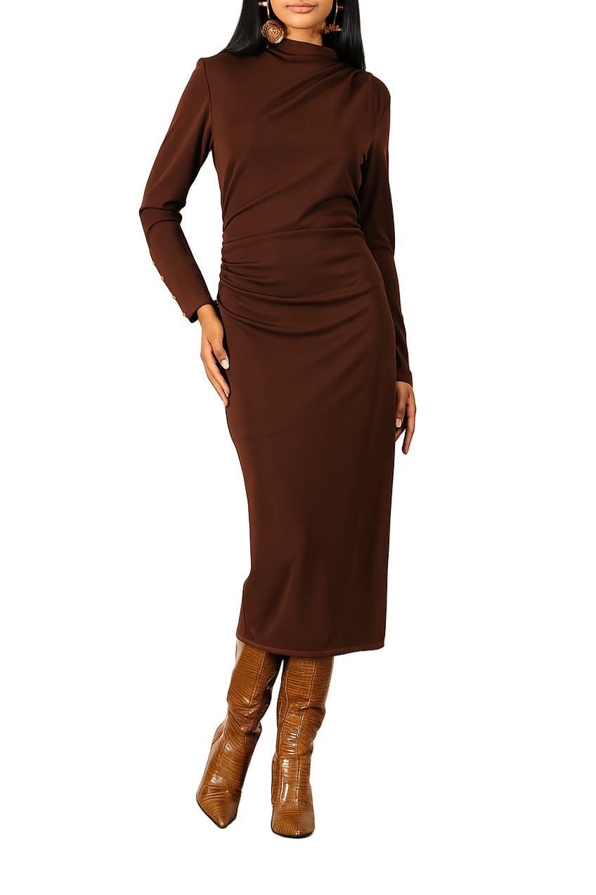 Abito midi a maniche lunghe con collo morbido e arricciatura laterale che valorizza la silhouette. Dettaglio elegante nei polsi con 4 bottoni oro per un tocco raffinato. Perfetto per look sofisticati sia da giorno che da sera.