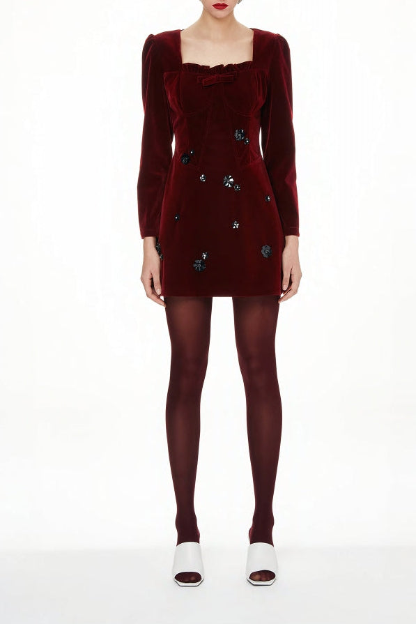 Questo abito è un mini-dress in velluto color bordeaux, caratterizzato da maniche lunghe, scollatura squadrata con piccolo fiocco centrale e applicazioni floreali lucide sul davanti. Ha una linea elegante e femminile, con un tocco rétro e raffinato.