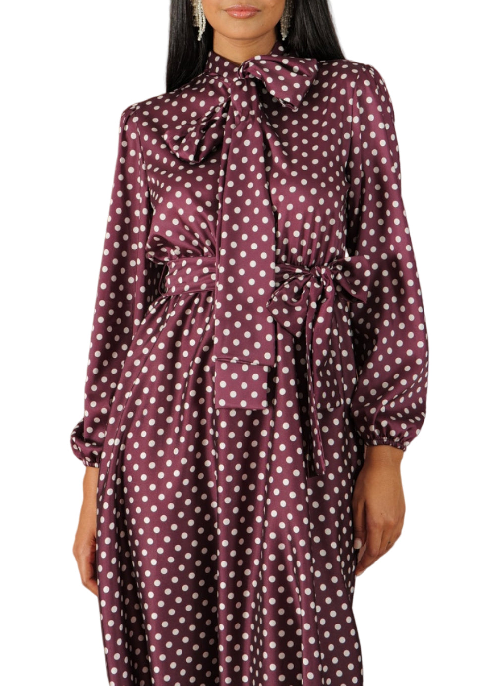 Abito lungo dal taglio morbido con pois color panna su fondo color vino. Il design è impreziosito da un ampio fiocco sul collo e da un altro in vita, che donano un tocco romantico e raffinato.