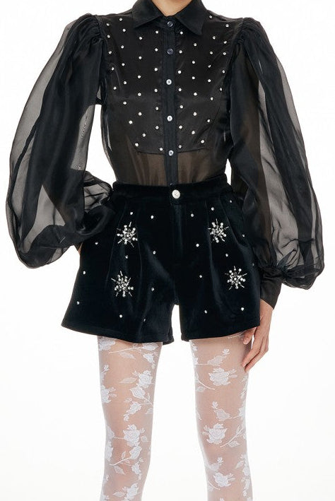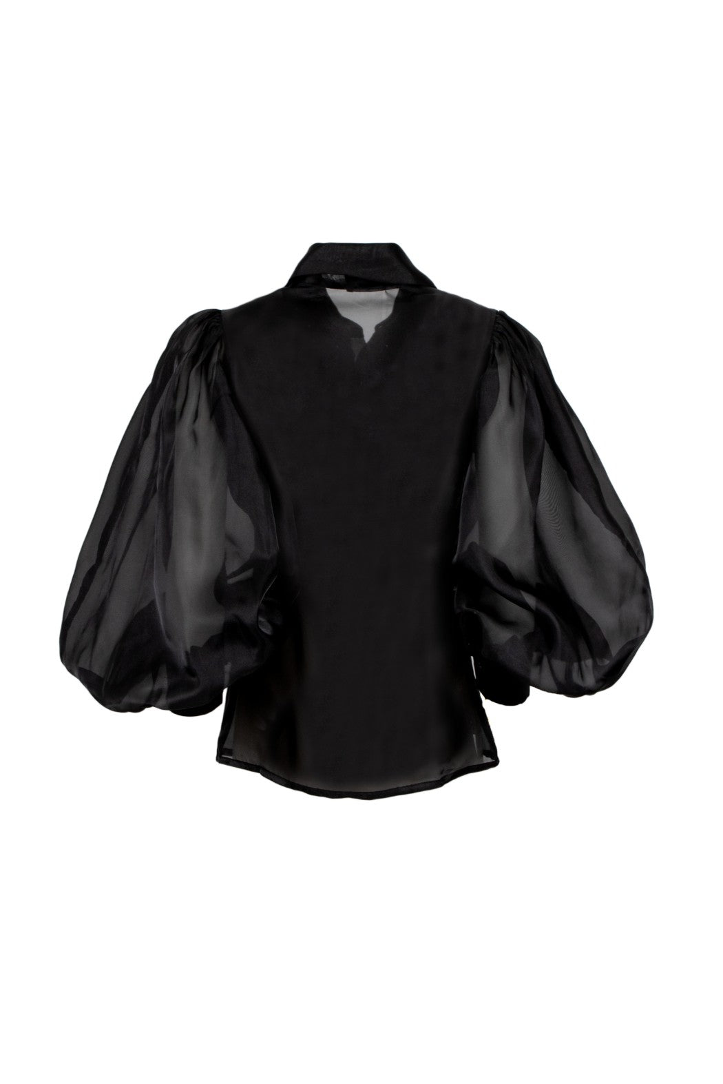 Camicia Yuma nera dallo stile elegante e moderno, con maniche larghe trasparenti che donano leggerezza e raffinatezza al look. Ideale per outfit sofisticati da giorno o da sera.