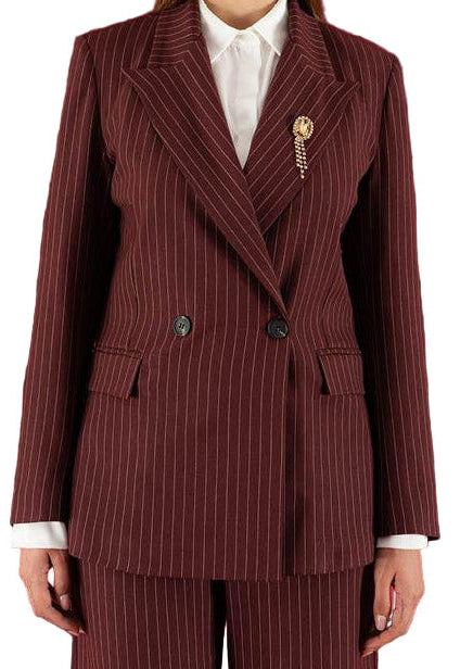 Giacca gessata bordeaux dal taglio sartoriale, caratterizzata da sottili righe verticali e impreziosita da una spilletta dorata sul revers, che aggiunge un tocco elegante e raffinato.