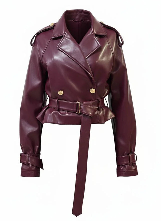Giacca corta in ecopelle color bordeaux, con doppiopetto, cintura in vita e dettagli metallici dorati. Design strutturato e moderno, perfetto per un look grintoso ed elegante.