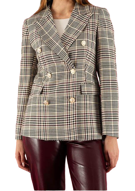 Giacca quadrettata nei toni bordeaux, beige e nero, dal taglio sartoriale, rifinita con eleganti bottoni dorati che ne esaltano lo stile sofisticato.
