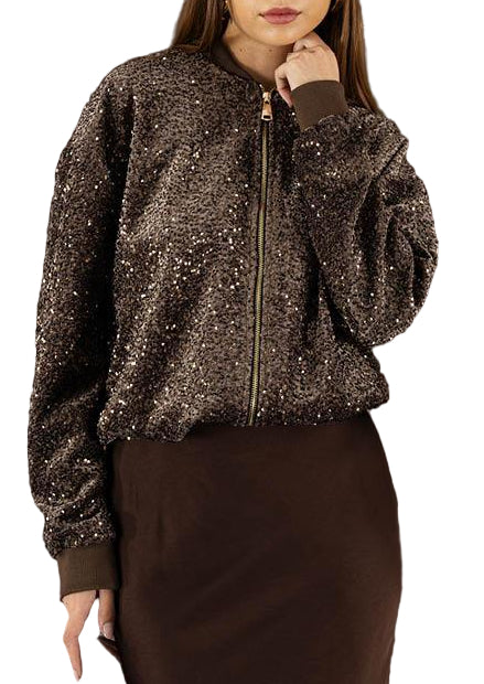 Giubbino realizzato in tessuto marrone con superficie interamente ricamata di paillettes, dona un effetto luminoso e glamour. Ha una chiusura frontale con zip, polsini e fondo in maglia elasticizzata tono su tono, che le conferiscono un taglio sportivo ma elegante.
