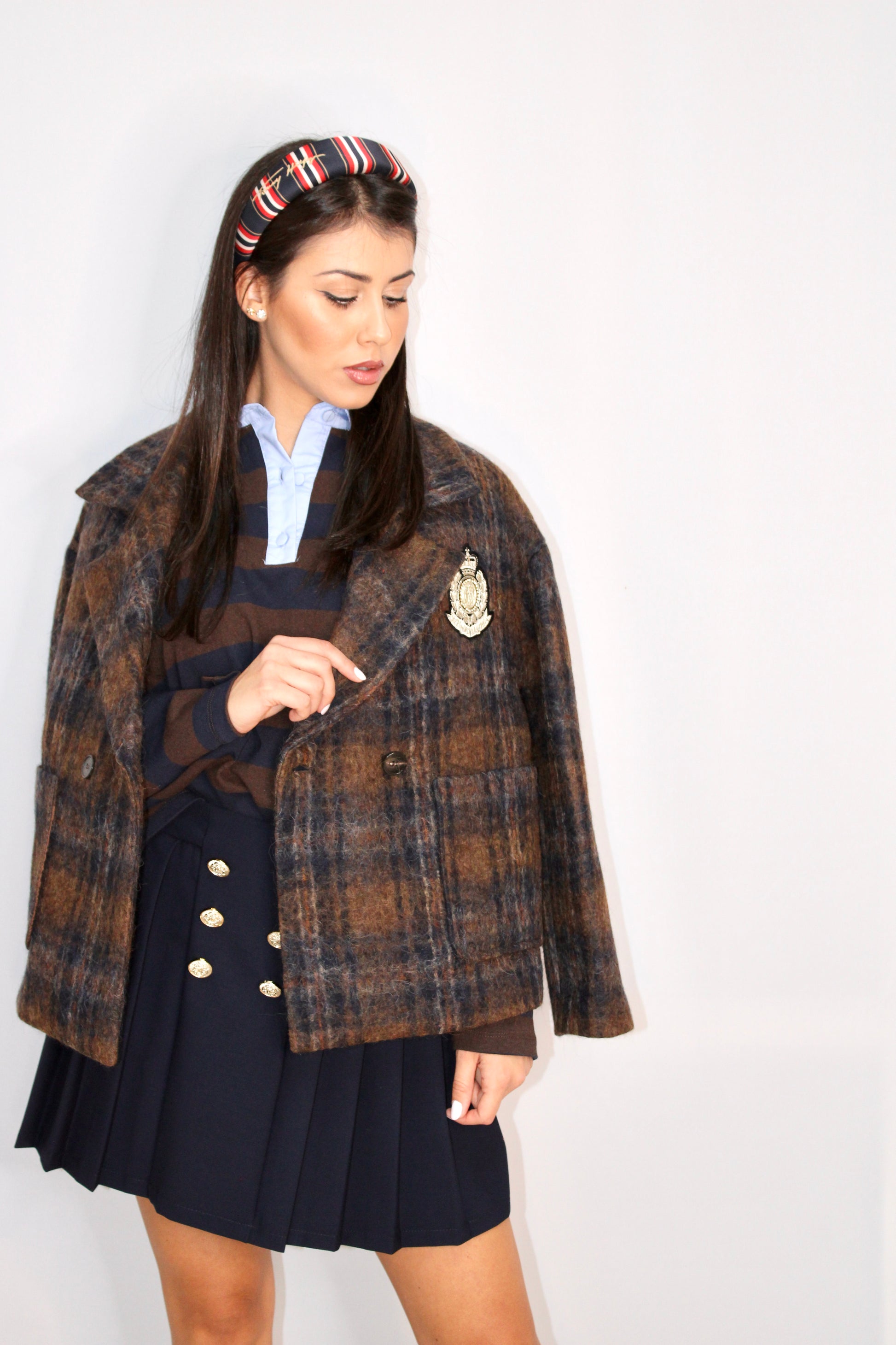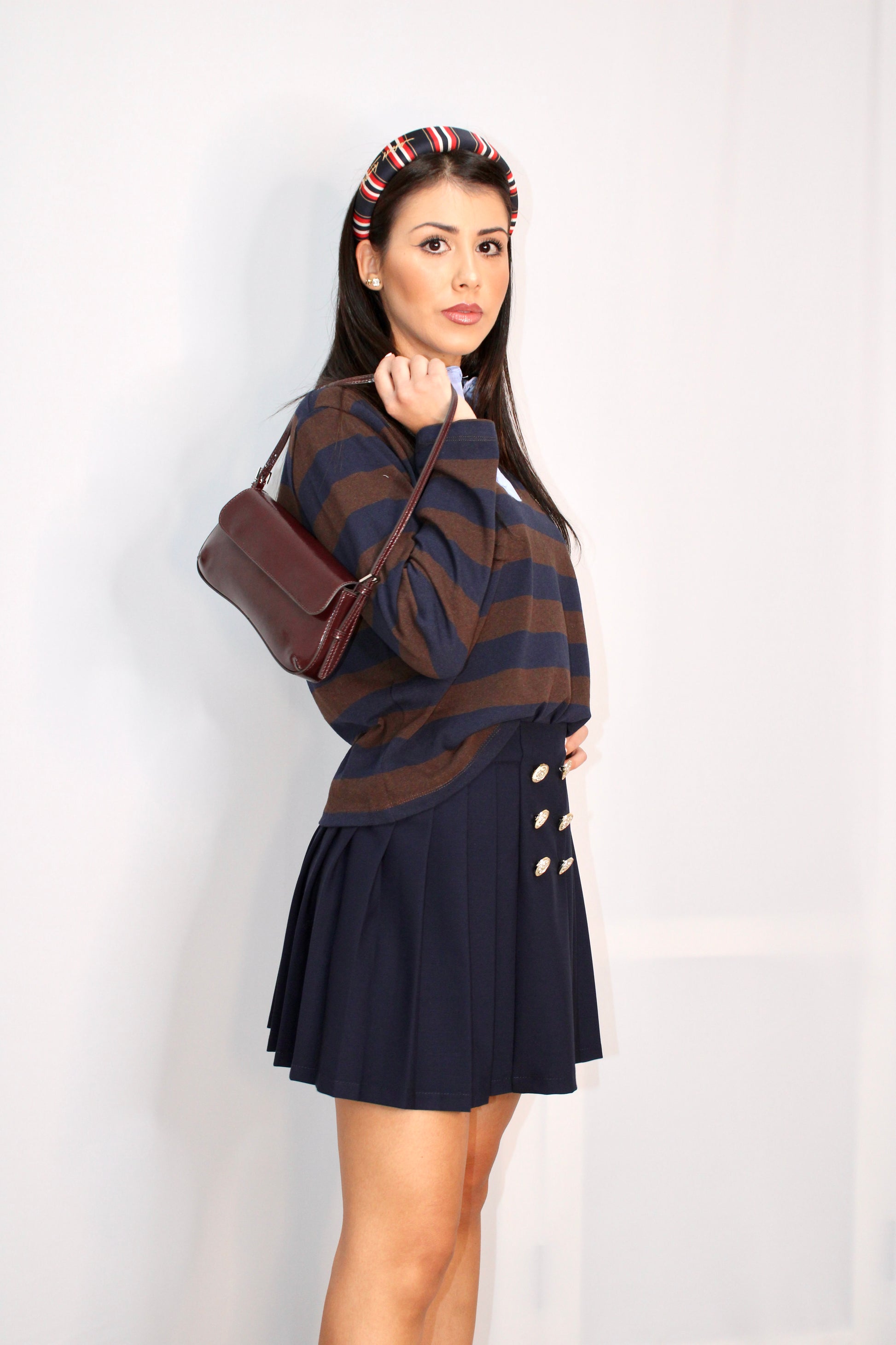 Gonna a ruota corta in tessuto blu, caratterizzata da eleganti pieghe plissettate che donano volume e movimento. Completano il design raffinato una fila di bottoncini dorati sul davanti, che aggiungono un tocco di luce e stile retrò.