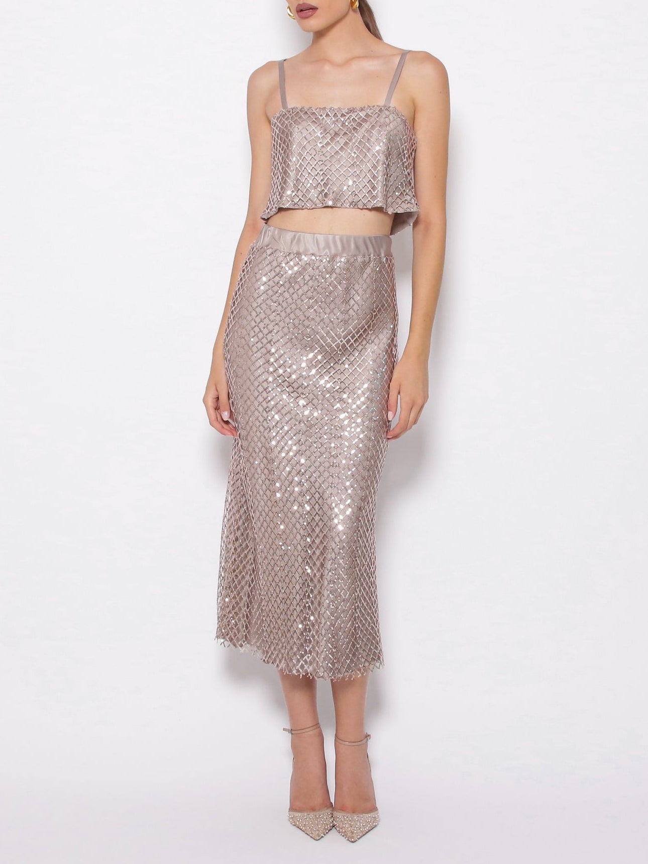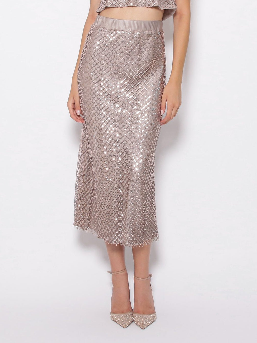 Gonna color tortora, ricoperta da una rete in paillettes.