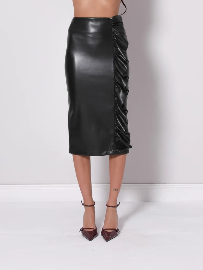 Gonna midi in ecopelle con rouche laterale: elegante e decisa, valorizza la silhouette con la sua linea aderente e il dettaglio ruches che dona movimento e stile.