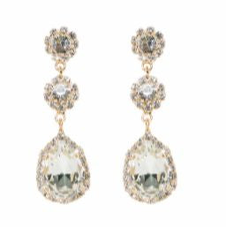 Questi orecchini hanno un design elegante con pietre a forma di goccia, incorniciate da cristalli brillanti. La parte superiore presenta due cristalli più piccoli, creando un look raffinato e luminoso.