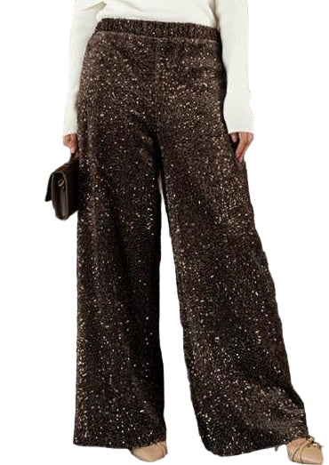 Panta Gabriella è un modello ampio e sofisticato a gamba larga. Realizzato in tessuto marrone con ricami di paillettes tono su tono, crea un effetto luminoso e raffinato.