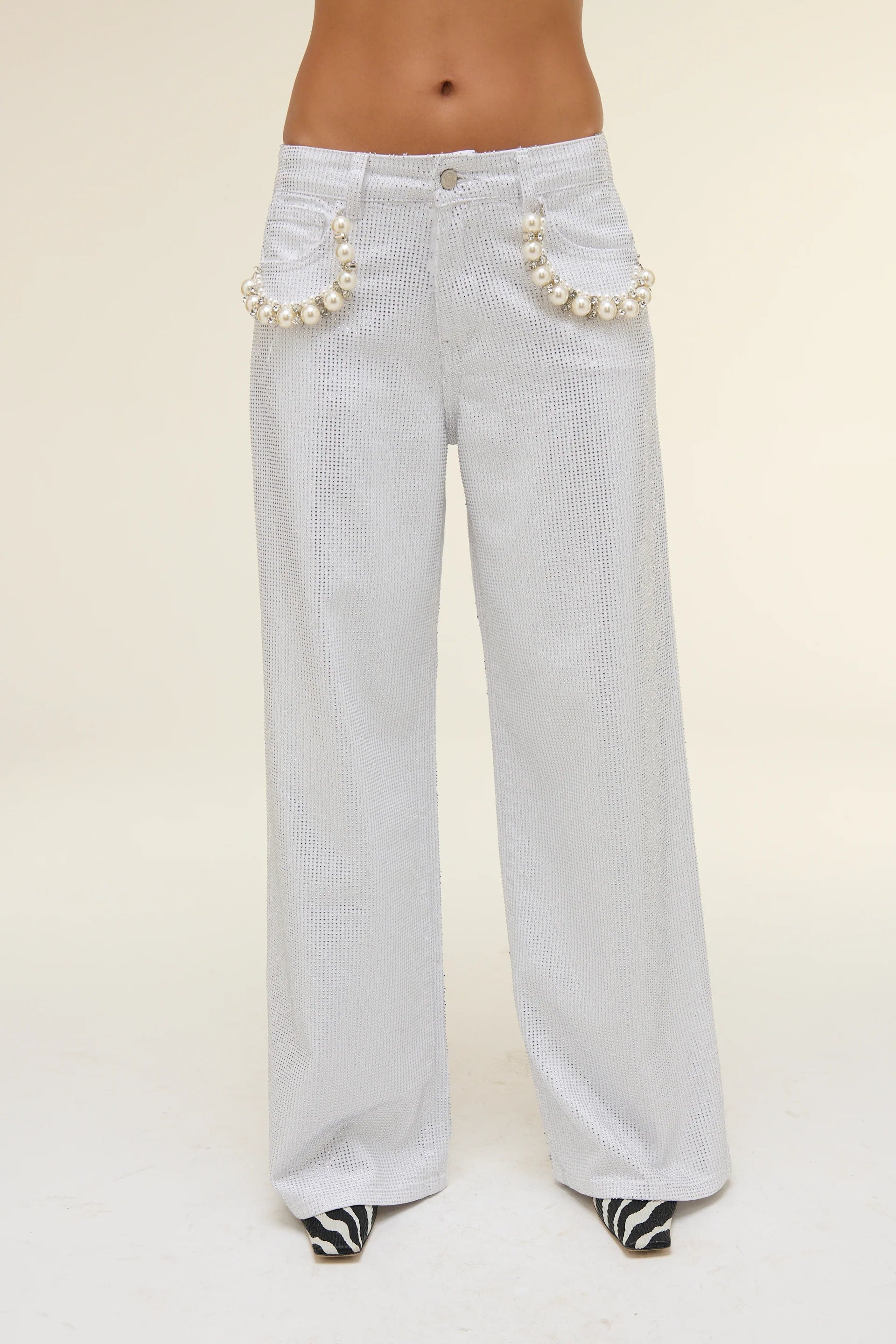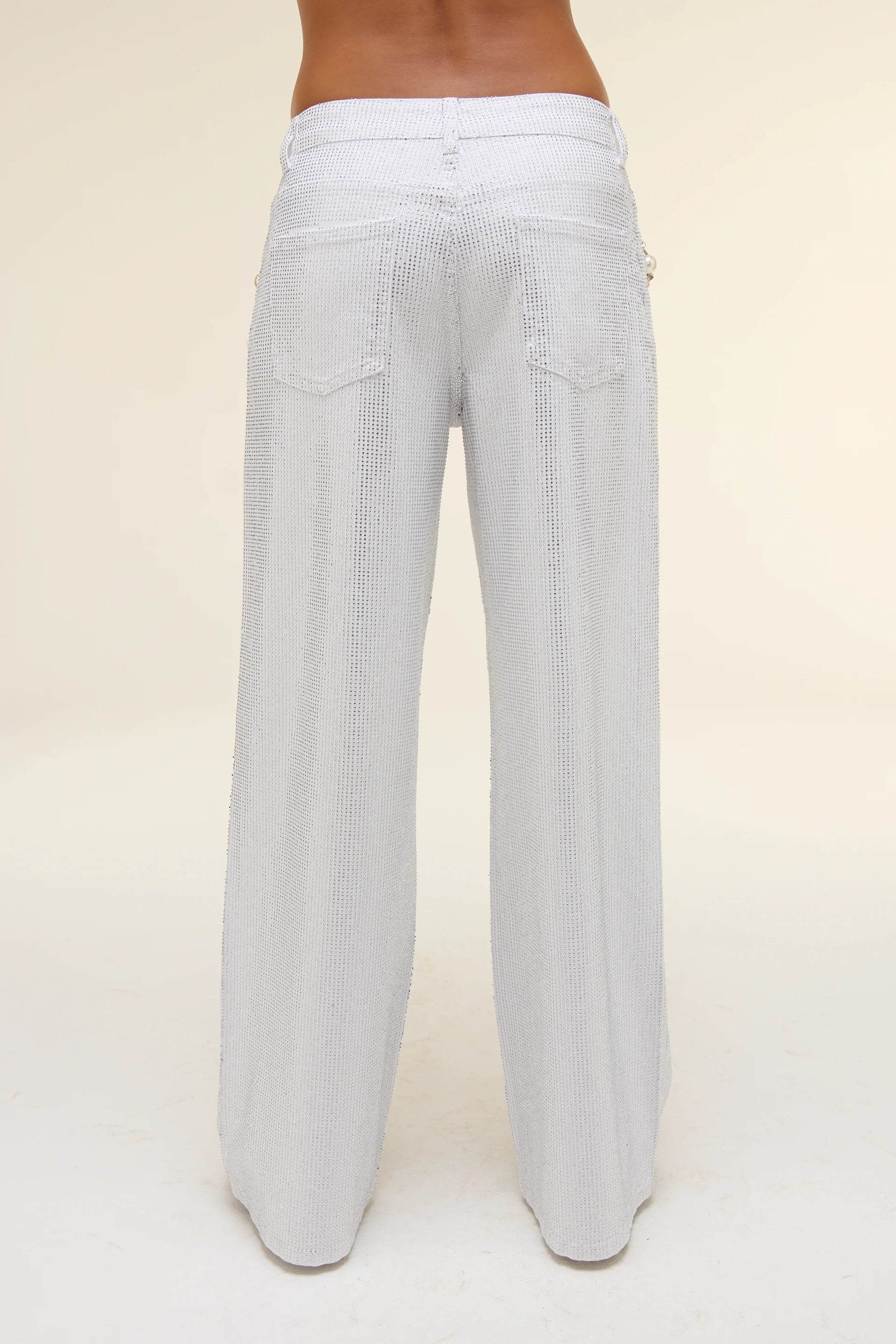 Pantalone bianco in denim dal carattere brillante, impreziosito da maxi perle sui bordi delle tasche. Un capo statement che unisce grinta e femminilità con stile.